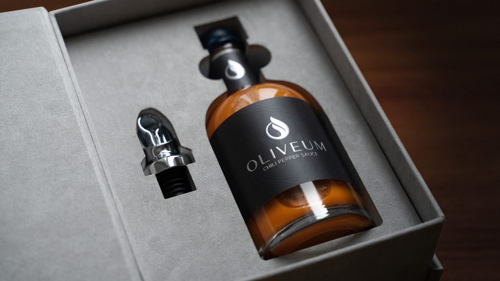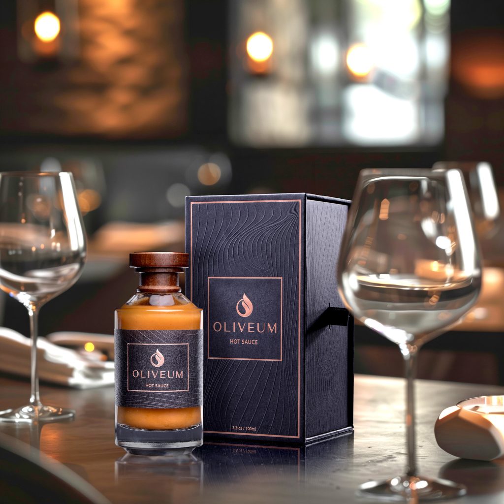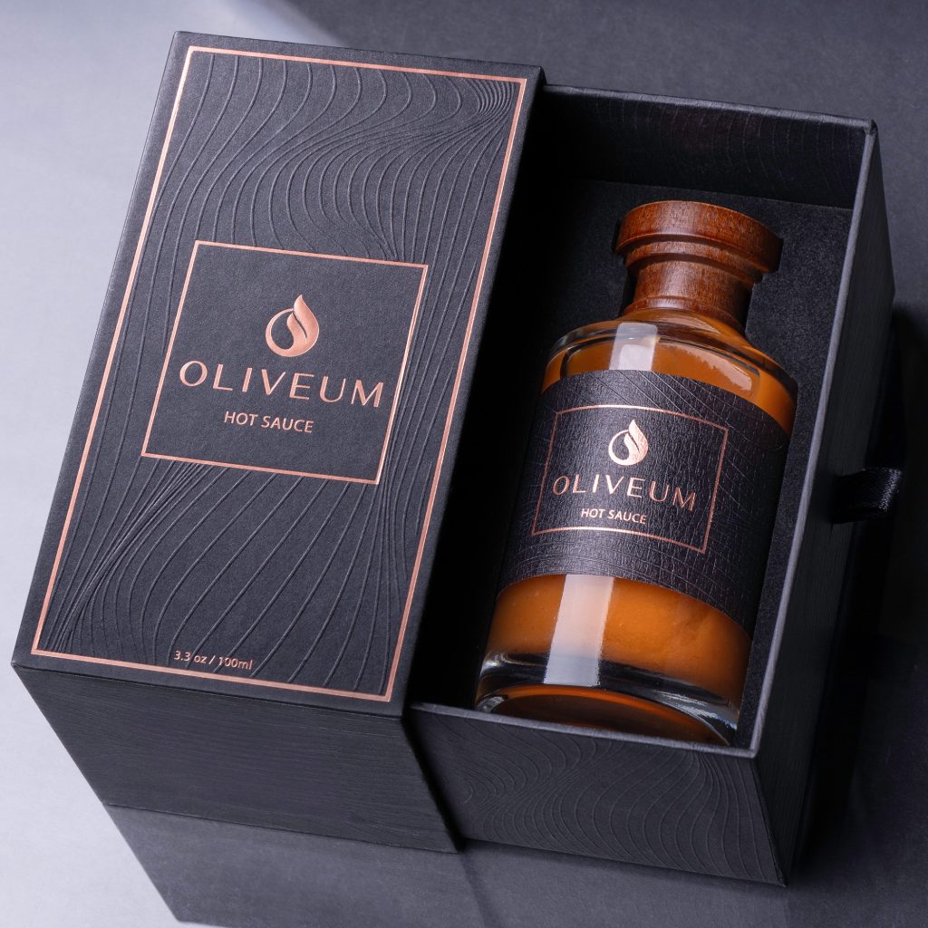 The world’s best hot sauce deserves a world-class presentation. Each bottle of Oliveum is delivered in a custom bottle, sealed with a walnut lid, and topped with a copper medallion. Our slide-out, laser-cut presentation box rivals the quality of the most expensive liquor brands.